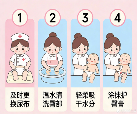 - 轻微发红:每次便后温水洗净、轻轻蘸干,保持干爽,勤换尿布;