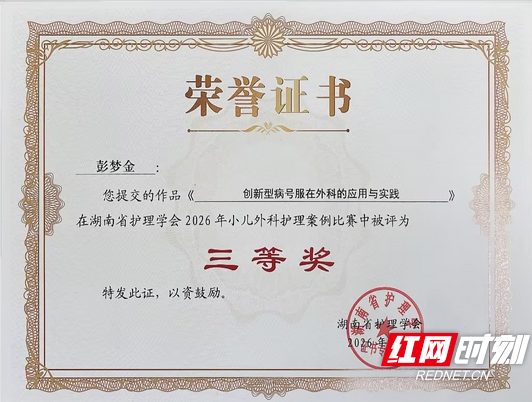 近日,湖南省护理学会2026年小儿外科护理案例比赛圆满落幕。衡阳市妇幼保健院小儿外科主管护师彭梦金凭借案例《创新型病号服在外科的应用与实践》荣获三等奖,展现了该院在护理专科创新领域的扎实功底。