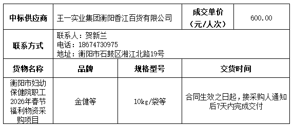 衡阳市妇幼保健院职工2026年春节福利物资采购项目于2026年1月20日结束,现将中标结果公告如下: