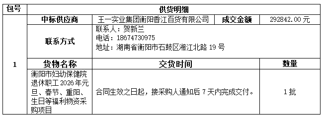 衡阳市妇幼保健院退休职工2026年元旦、春节、重阳、生日等福利物资采购项目于2026年1月23日结束,现将中标结果公告如下: