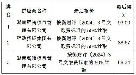 我院近期组织了“衡阳市妇幼保健院异地新建项目智慧医院招标代理机构”遴选评审工作。评审小组由随机抽取的专家组成,遵循公平、公正、科学、择优的原则对各响应文件进行了评审。现将评审结果公示如下: