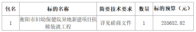 1、采购项目名称: 衡阳市妇幼保健院异地新建项目扶梯装潢工程项目